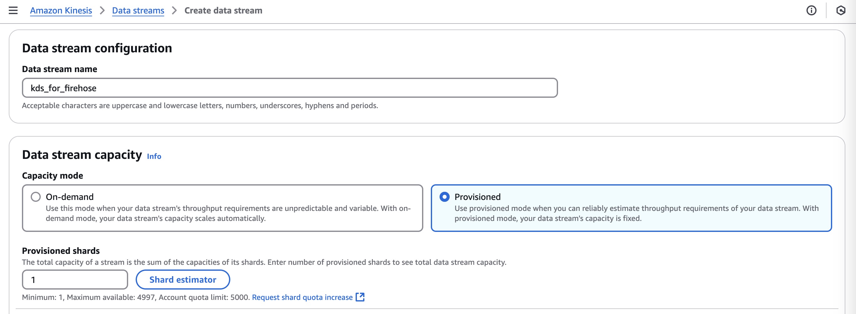 Open the Amazon Kinesis console. Choose Create data stream. Specify the configuration, such as the Data stream name “kds_for_firehose”, Capacity mode “Provisioned”, and Provisioned shards “1”, and choose Create data stream.