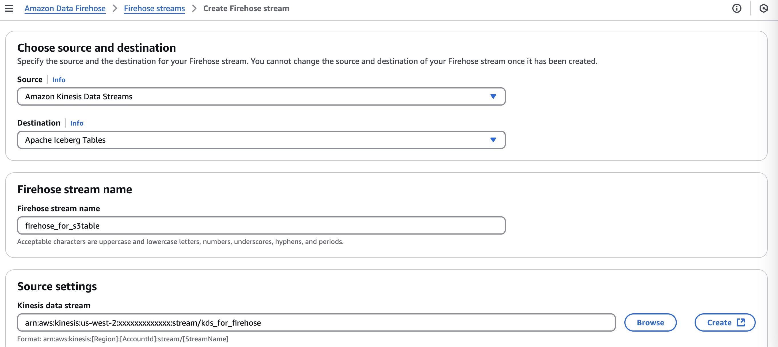 - Kinesis data stream: “arn:aws:kinesis:us-xxxx-x:5853xxxxx:stream/kds_for_firehose”.