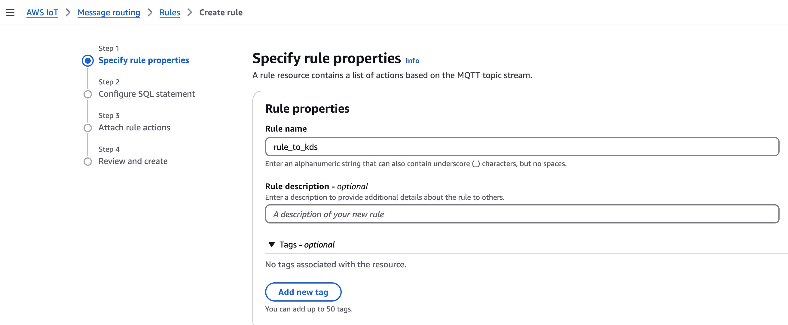 Use the route engine of AWS IoT Core to transfer messages to other AWS services. Open Message routing>Rules on the AWS IoT Core console. Choose Create rule. Specify the rule properties.