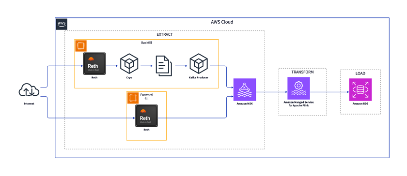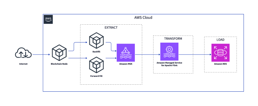The blockchain node is connected to the Ethereum blockchain. The back fill and the forward fill components retrieve data from the blockchain node. After extraction, the data is loaded to the intermediary storage in Amazon Managed Streaming for Apache Kafka (Amazon MSK). The data is transformed with Amazon Managed Service for Apache Flink and loaded to a database like Amazon Relational Database Service (Amazon RDS).