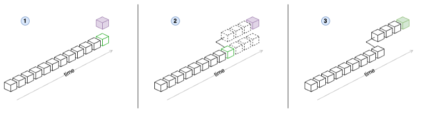- A new block (purple) appears that doesn’t follow the current canonical head (green).