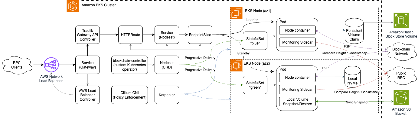 We placed Traefik behind an AWS NLB managed by the AWS Load Balancer Controller. The choice of NLB wasn’t arbitrary; the NLB’s static IP address and support for AWS PrivateLink allow us to provide reliable RPC services wherever clients may be running. Within the cluster, we use Cilium CNI for its highly performant, eBPF-powered traffic management and policy enforcement.