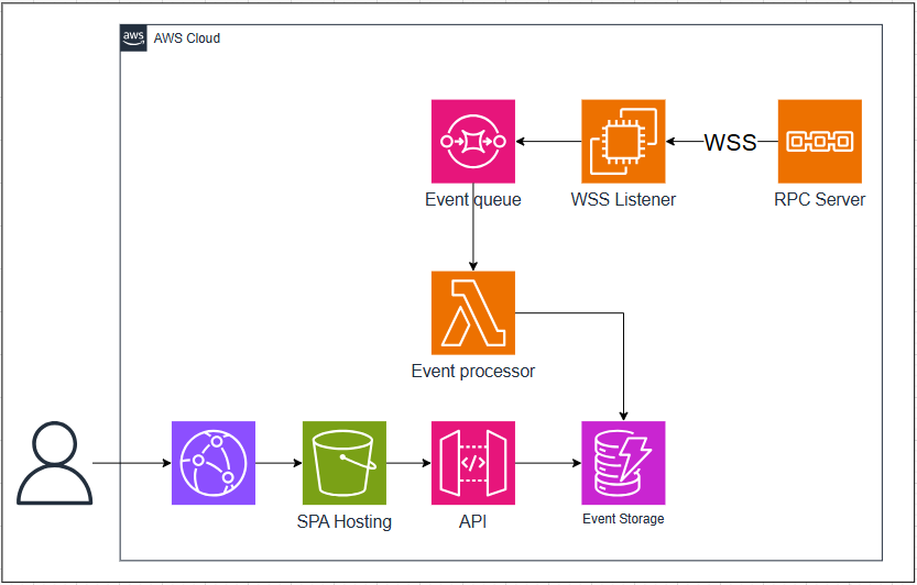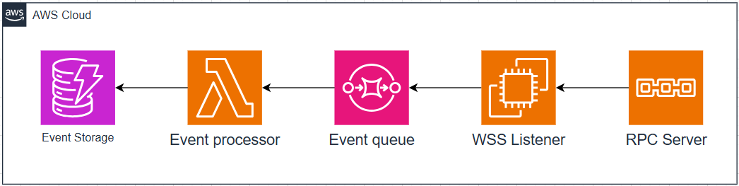 - An EC2 instance hosts our event listener application, which establishes a WebSocket connection to an ETH RPC node. This listener’s sole responsibility is to capture relevant events and forward them to an SQS queue, maintaining a clean separation of concerns.