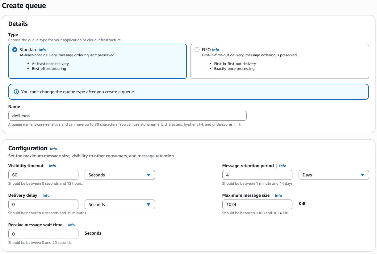 Note that while standard queues can handle up to 3,000 transactions per second, DeFi applications can generate significant event volume. Monitor your queue metrics and adjust batch sizes accordingly. The remaining settings can be left to the defaults.