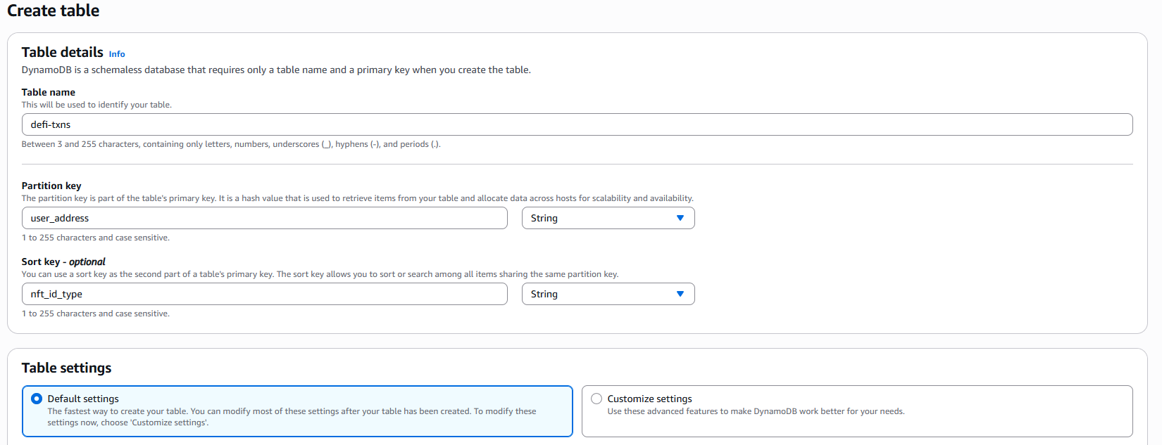 The partition key (user_address) enables efficient queries for all positions belonging to a specific user, while the sort key (nft_id_type) allows for chronological ordering and filtering of specific position types. The sort key is a concatenation of the nft_id and the event type that is created in the event listener. The remaining settings can be left to the defaults.