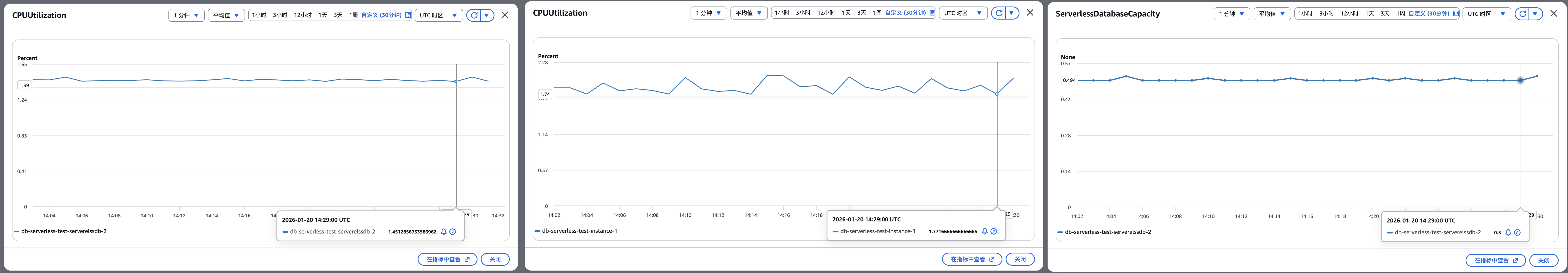 未加压测时,预置实例 CPU 约 1.5%,Serverless CPU 同样处于极低水平,Capacity 维持 0.5 ACU 最低容量待机,系统整体处于空闲状态。