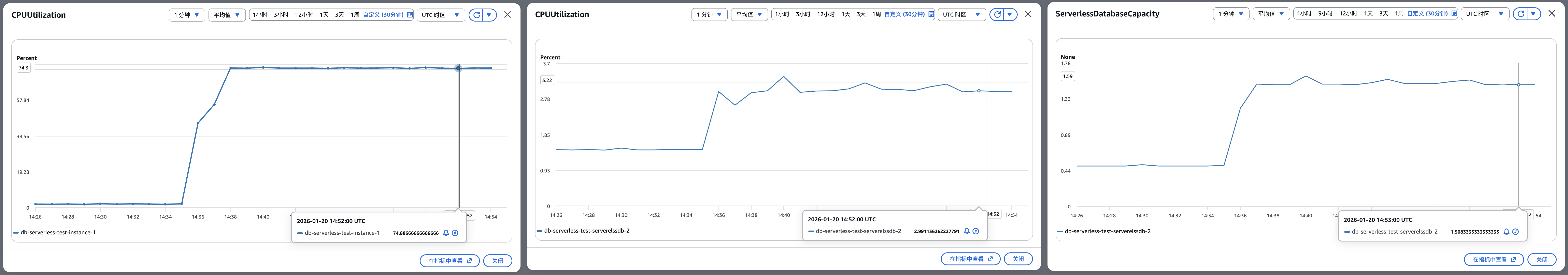 压测启动,开启相关的写入读取请求后,预置实例 CPU 推至 74%,Serverless CPU 小幅跟随上升,Capacity 上升到 1.5 ACU,Serverless 此时仅作为热备。