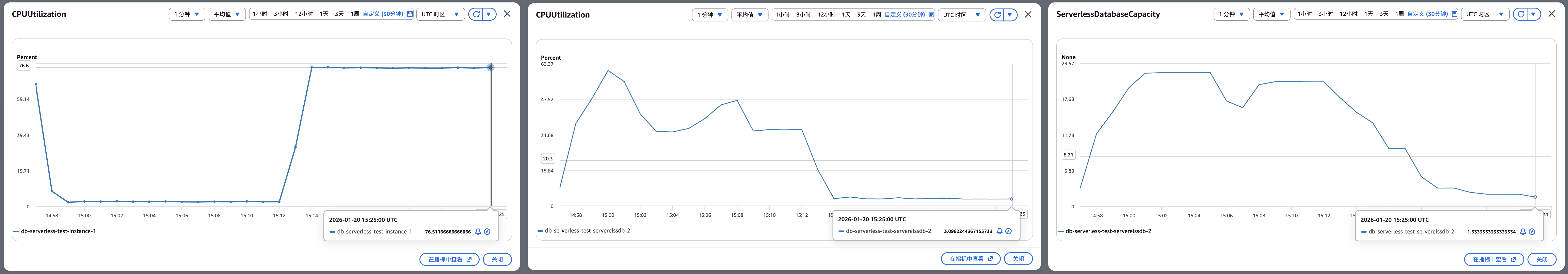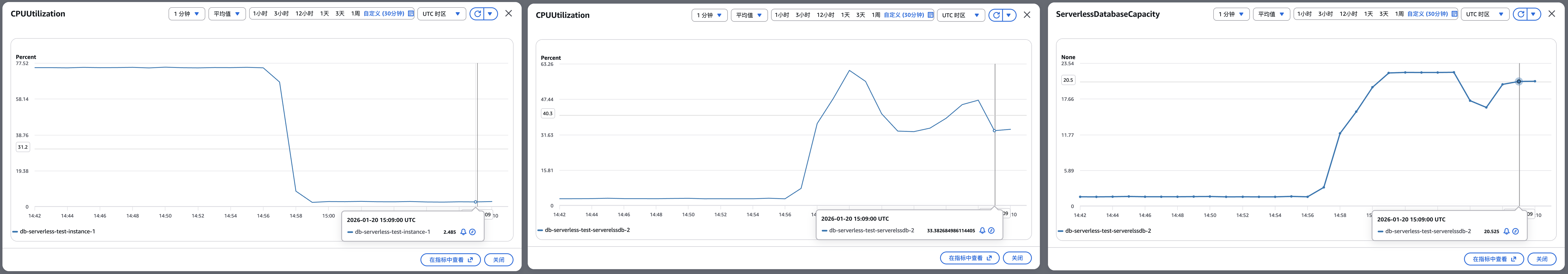 手动触发故障转移:故障转移时间约为20秒,转移完成后,预置实例重新接管所有流量,CPU 快速恢复至 76%,测试负载保持 400 QPS 写入 和 16000 QPS 读取,Serverless CPU 大幅下降至低位,Capacity 随之开始缩容,最终稳定在 1.5 ACU。