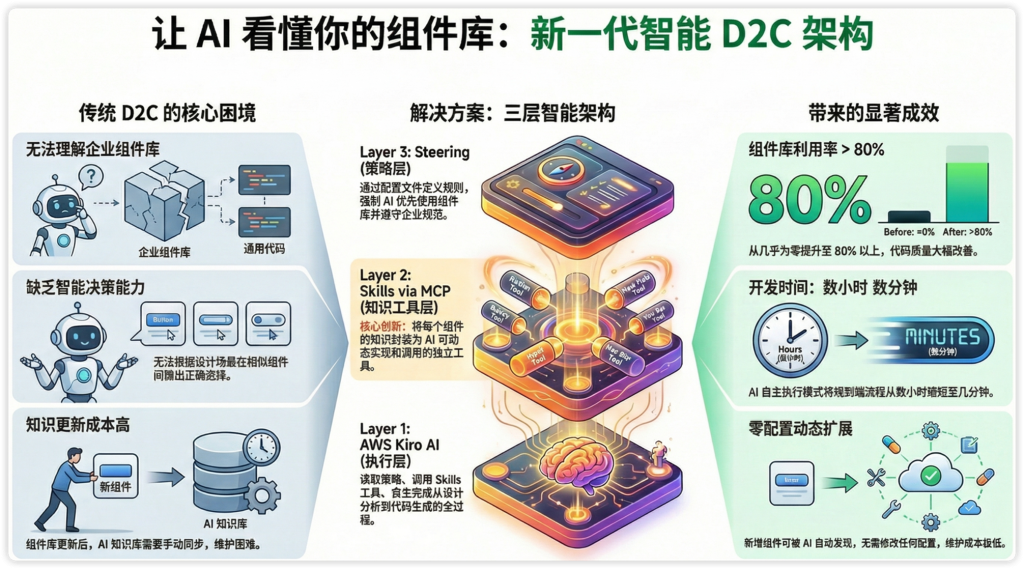 本文探讨了如何利用 AWS Kiro IDE、Model Context Protocol (MCP) 和 Skills 构建智能 D2C 平台。核心创新在于通过 Skills 将组件知识封装为可调用工具,结合 Steering 策略引导,使 AI 能够自动发现、理解并正确使用企业组件库。