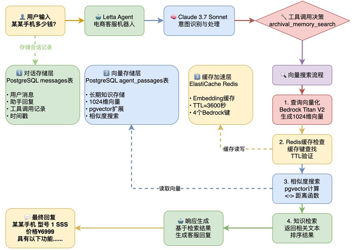Letta可无缝对接亚马逊云科技服务栈,以下是一个通过 Letta 框架搭建的电商客服机器人问答流程示例: