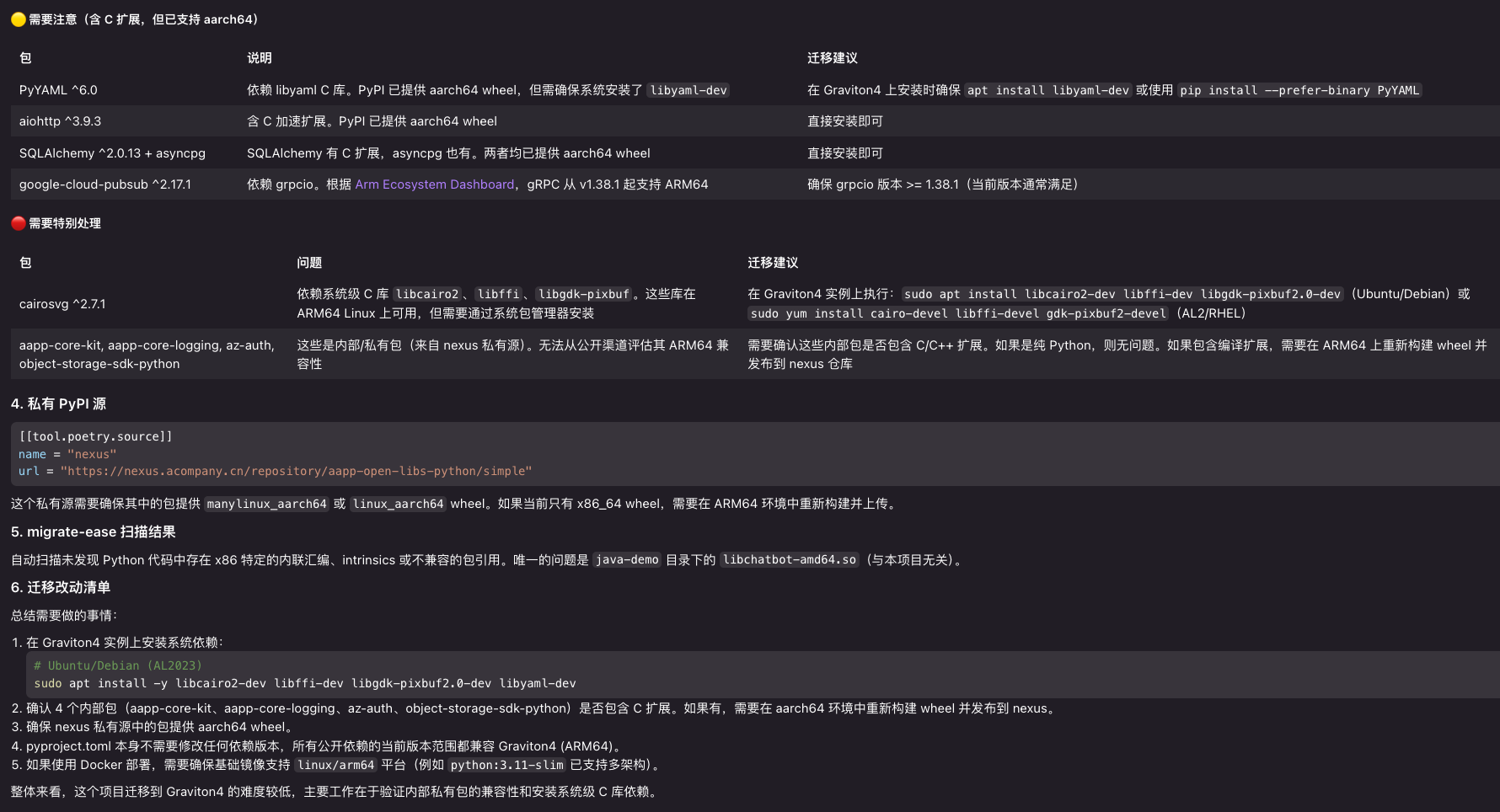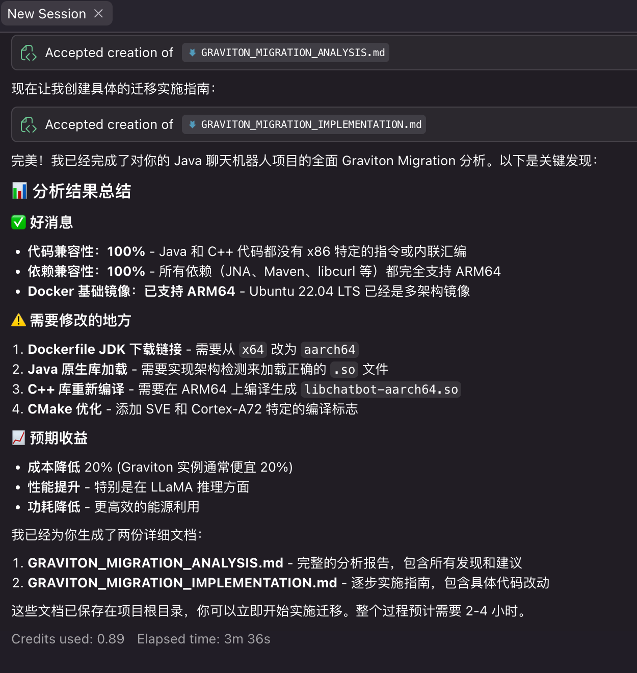 基于 Kiro Graviton Migration Power 生成的详细迁移分析报告,开发团队可以有针对性地进行代码适配工作。报告中包含的具体修改建议、代码示例和最佳实践为团队提供了清晰的执行路径。