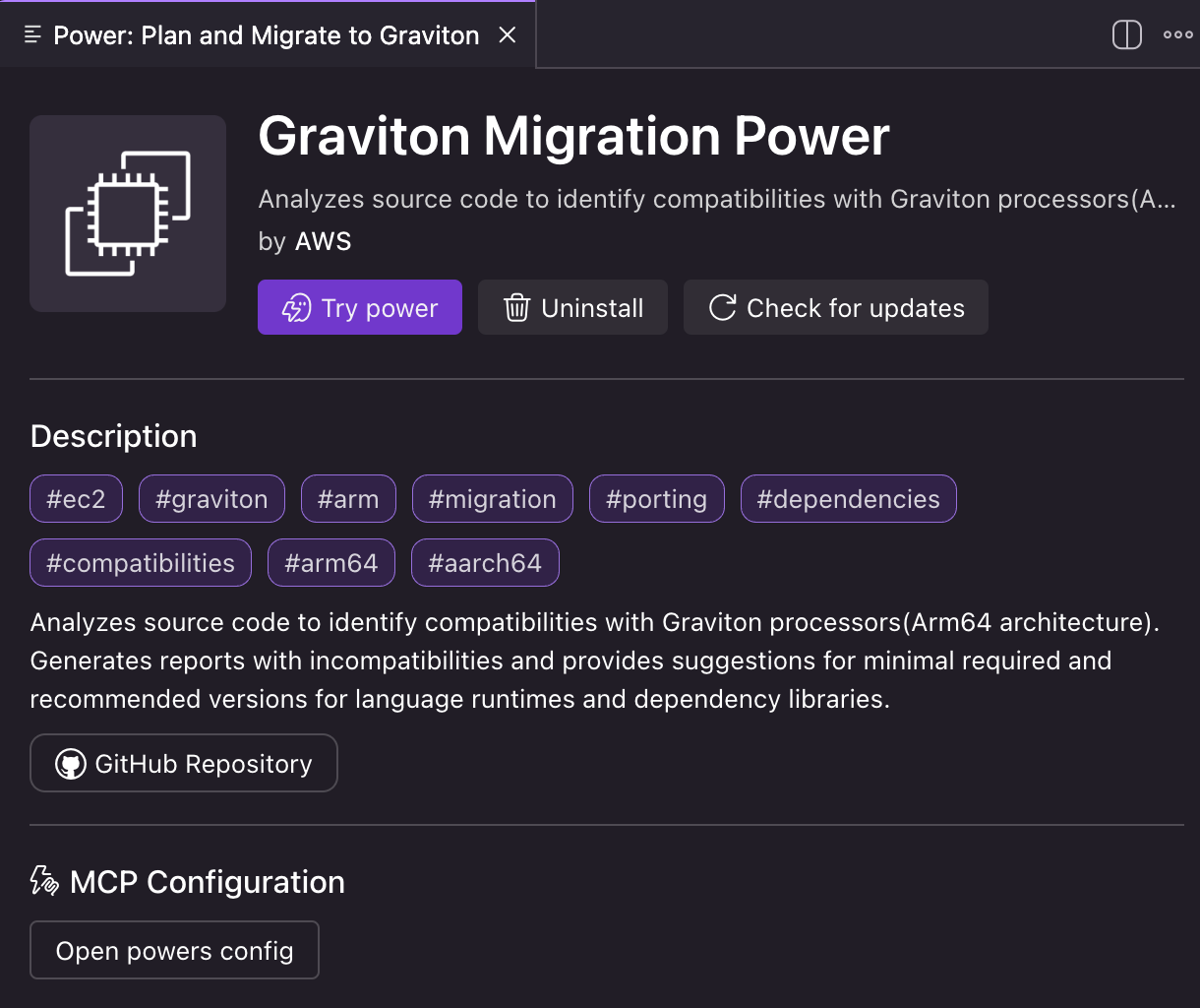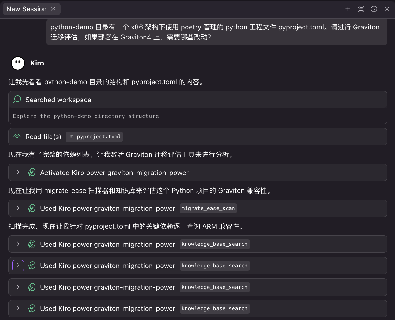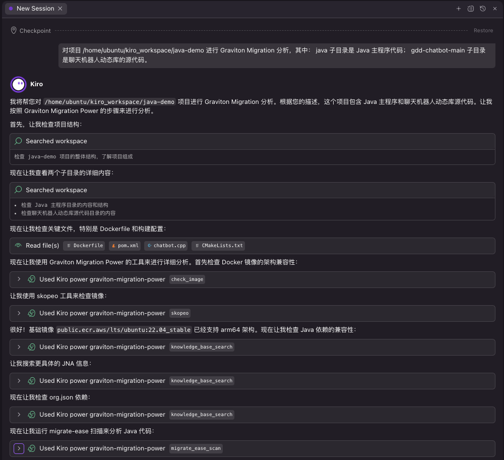 同样,可以看到 Kiro 激活了 Graviton Migration Power 进行评估: