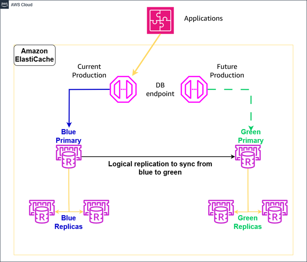 - 绿色集群:新 ElastiCache for Redis OSS 集群(新版本),地址是redis-green.abcdef.ng.0001.use1.cache.amazonaws.com:6379