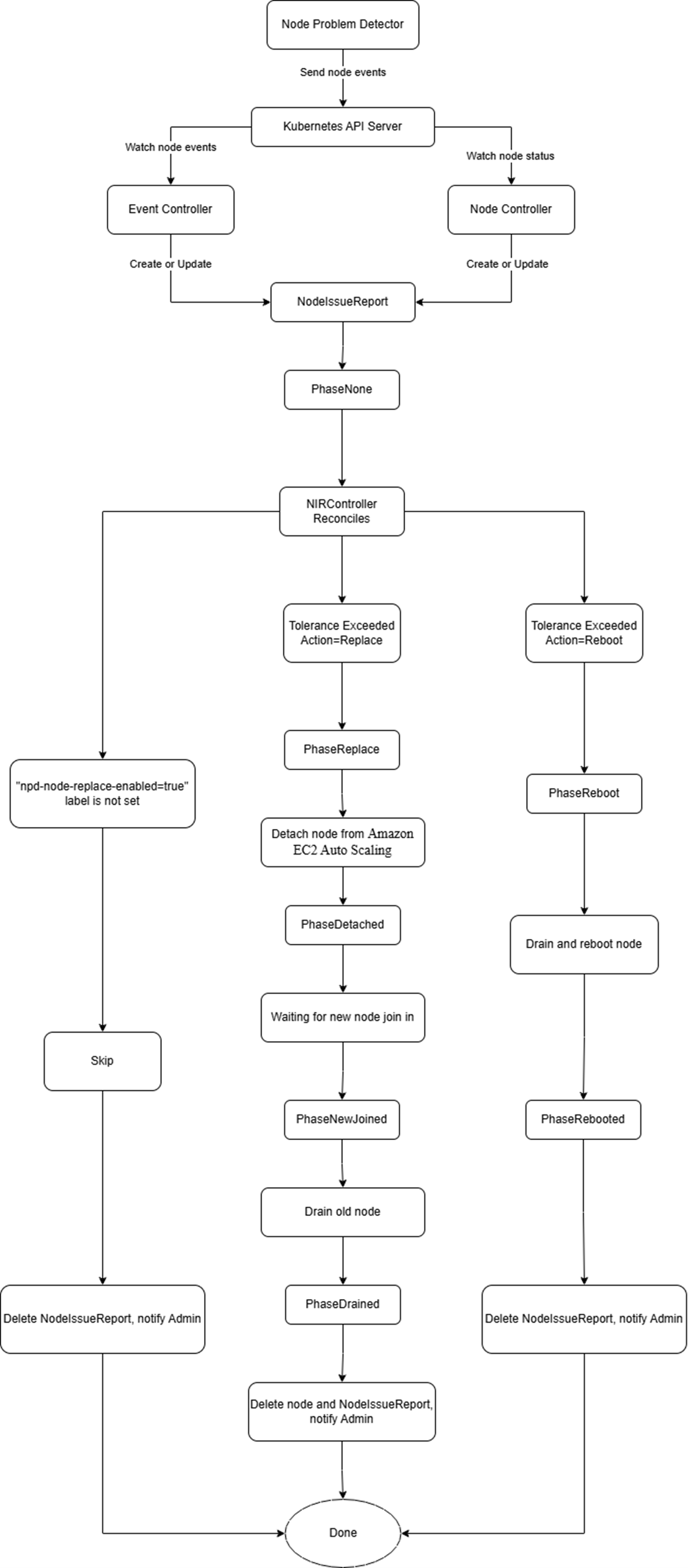 - NIRController 在接收到 NodeIssueReport 资源的变更之后,通过与用户的 Tolerance 配置作对比,判断是否要进行 Reboot 或 Replace 操作