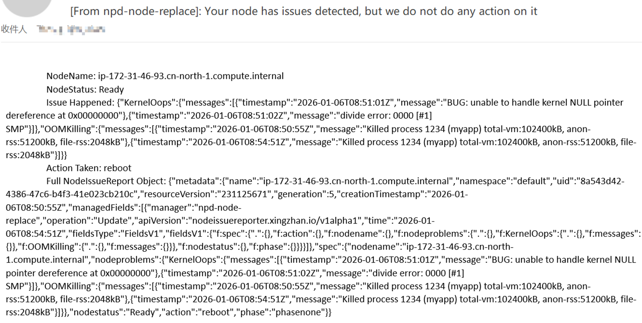 先部署相关组件,但暂不为任何节点添加 npd-node-replace-enabled=true 标签;随后观察邮件通知,确认 NPD 能正常检测到集群中的节点问题以及 npd-node-replace 可以通知管理员。