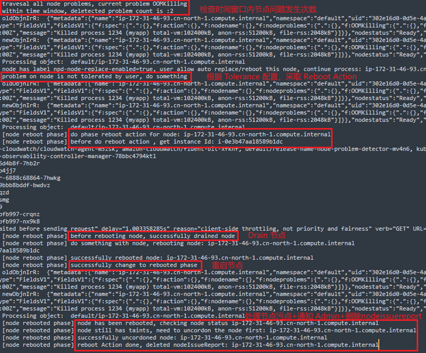 模拟问题触发节点 Reboot 操作,基于上述配置过程中的 Tolerance 配置,两次 OOMKilling 事件即可触发节点重启,日志输出如下,从日志中可以观察到节点重启的工作流程为: