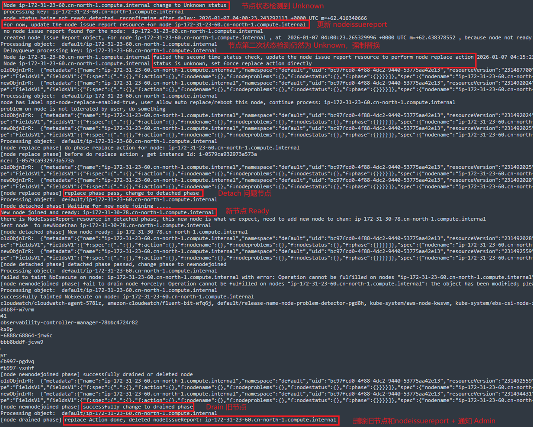 [Pic 7 节点 Unknown 状态强制替换日志] |