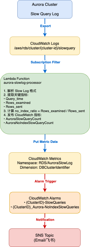 本方案通过 CloudWatch Logs + Lambda + CloudWatch Metrics/Alarms 的 Serverless 架构,实现了对 Aurora 慢查询的精准监控和智能分析。相比 AWS 原生监控能力,具有以下显著优势: