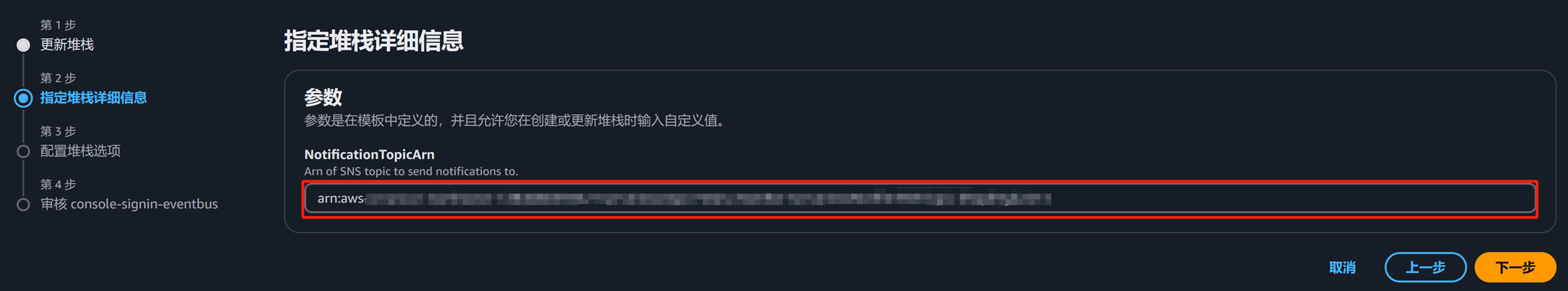 接下来到CloudFormation控制台,部署这个模板。部署的时候需要填入记录的SNS topic arn作为参数: