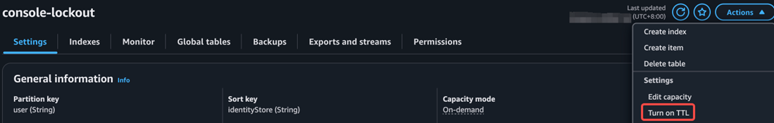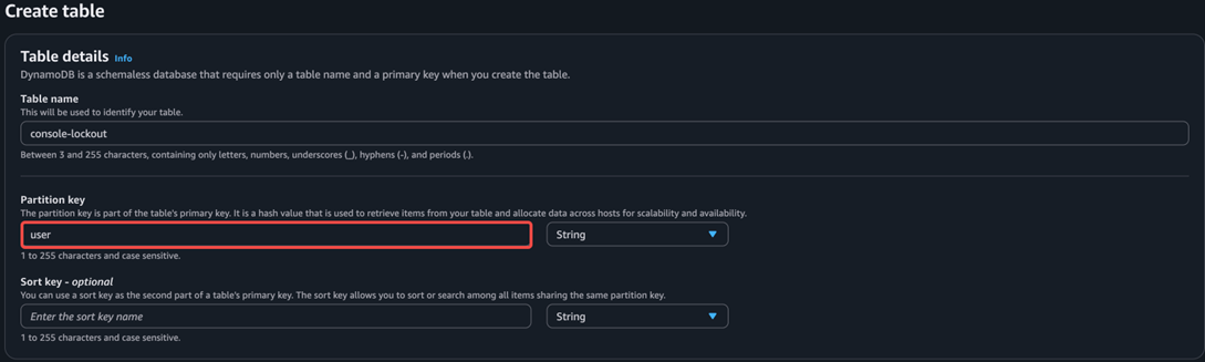 首先,在主区域创建一个DynamoDB表格,表名为”console-lockout”(与Lambda函数中的变量相对应)。该表格的分区键为”username”(与Lambda函数中的变量相对应,请注意不要设置任何排序键):