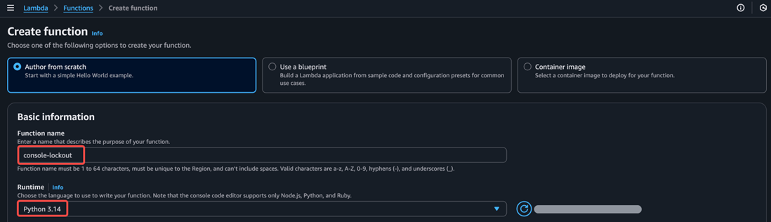 接下来,创建一个Lambda函数,运行时为Python:
