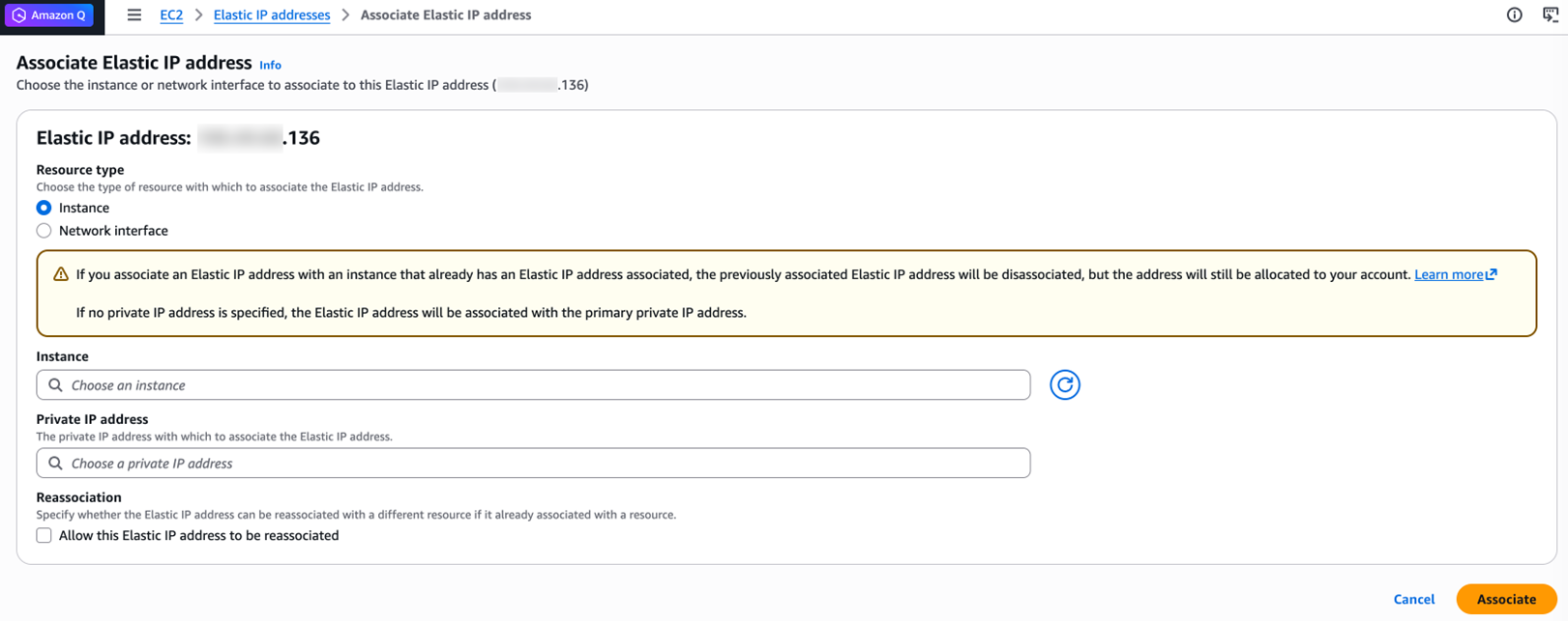IP 地址段成功 Provision 和 Advertise 后,可以从该地址池中分配弹性 IP 地址(EIP)。在 AWS 控制台或 CLI 中分配 EIP 时,需要在”Public IPv4 address pool”选项中选择”Public IPv4 address that you bring to your AWS account with BYOIP”类型。