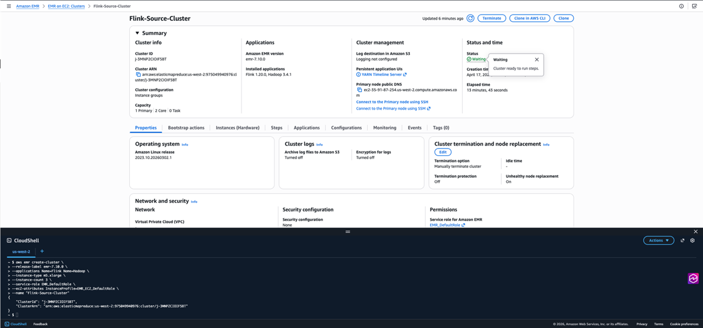 在开始之前,有一点值得说明。EMR 控制台显示的 **Flink 1.20.0** 是 Apache 开源社区的基础版本号,而实际安装的 **Flink 1.20.0-amzn-4** 是 AWS 基于开源版本的定制构建,包含 AWS 服务集成优化、安全补丁和性能改进。EMR 中的 Flink 版本与 EMR 发行版绑定,选择 `emr-7.10.0` 即自动获得 `Flink 1.20.0-amzn-4`,因此打包时需要使用完全相同的 EMR 版本。