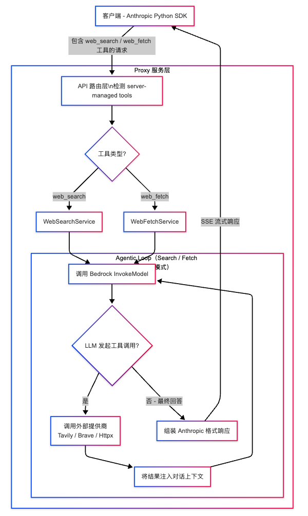 自建Proxy服务作为中间层,拦截包含 server-managed tool 声明的请求,将 Bedrock 无法识别的工具类型(如 type: “web_search_20250305″)替换为标准的 tool definition(包含 name、description、input_schema 字段),再通过 Agentic Loop(代理循环) 自行编排搜索或抓取的执行过程——包括调用 Bedrock 模型、调用外部搜索/抓取提供商获取真实数据,以及将结果注入对话上下文后继续推理——最终将整个多轮执行过程的最终结果组装为与 Anthropic 官方 API 完全一致的响应格式,对客户端完全透明。