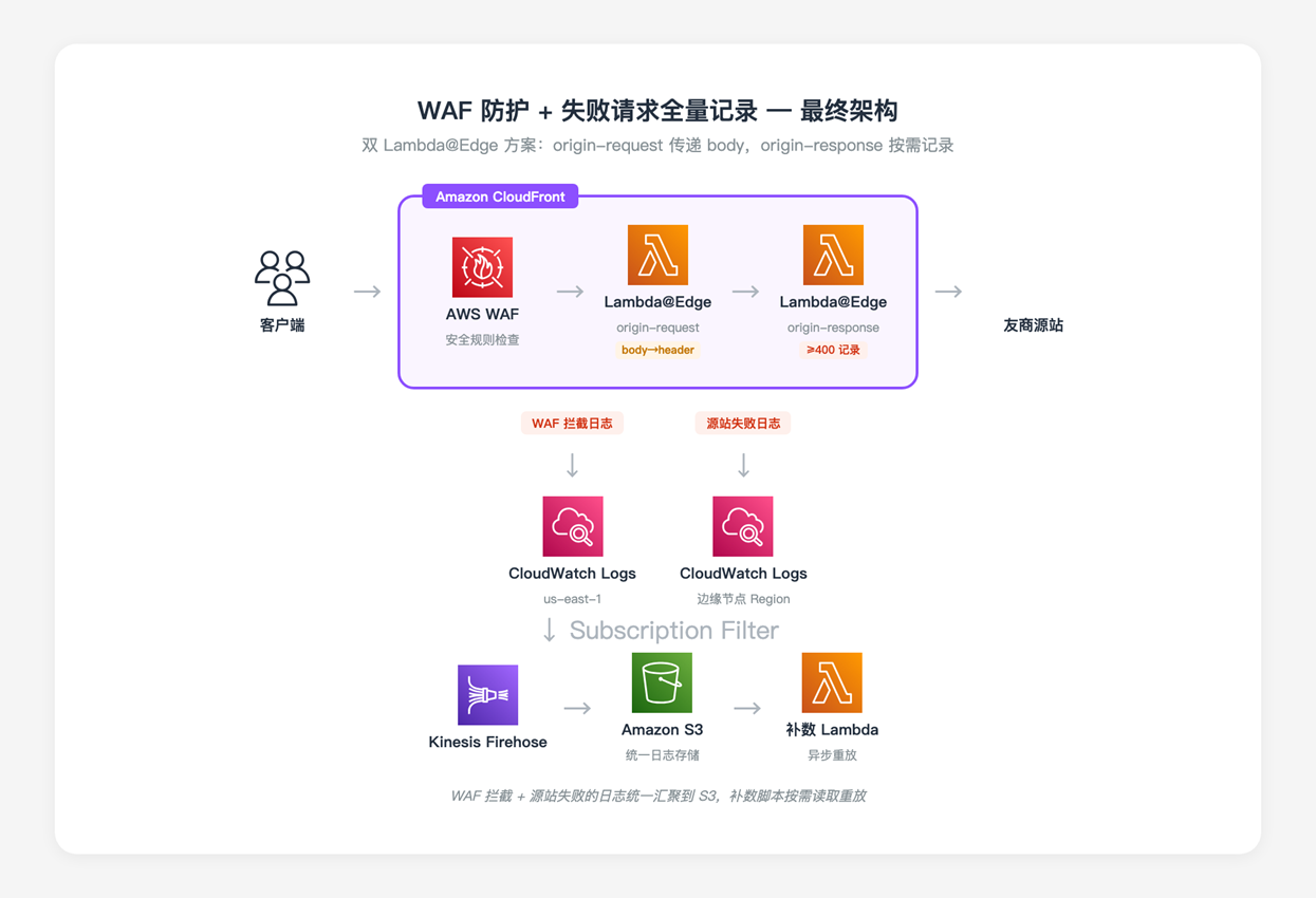 适用场景:源站部署在非 AWS 环境且无法修改代码、需要记录完整请求信息用于数据补偿、需要同时覆盖 AWS WAF 拦截和源站错误两类失败场景。
