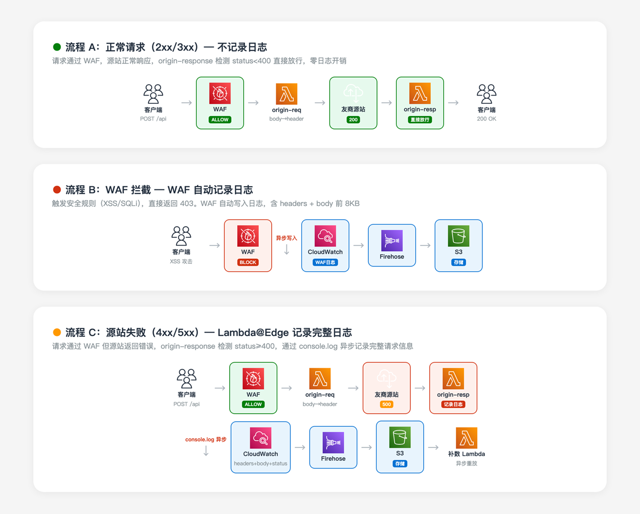 A:被 AWS WAF 拦截的请求不会到达 Lambda@Edge 阶段。AWS WAF 有独立的日志记录机制,可以将拦截日志写入 Amazon CloudWatch Logs(包含 headers 和 body 前 8KB)。本方案通过配置两条独立的日志采集路径,分别处理 WAF 拦截请求和源站错误请求,最终统一汇聚到 Amazon S3。