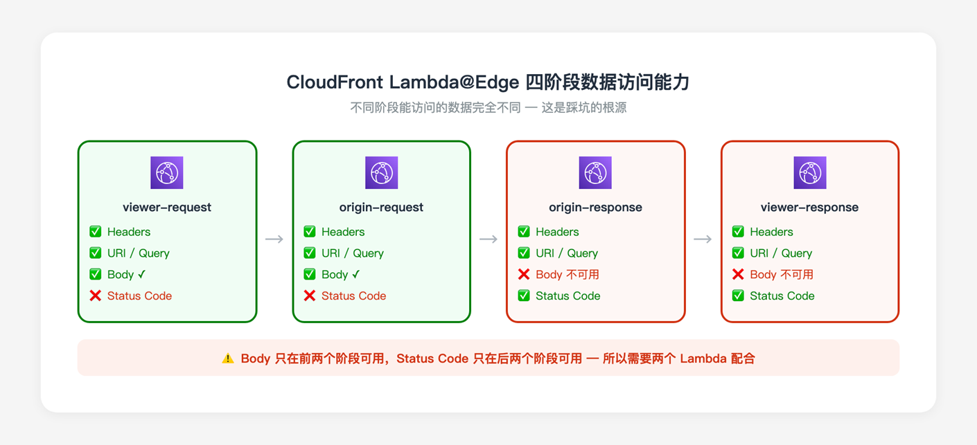 这意味着单个 Lambda@Edge 函数无法在 origin-response 阶段同时获取响应状态码和请求体,因此需要采用双函数架构。