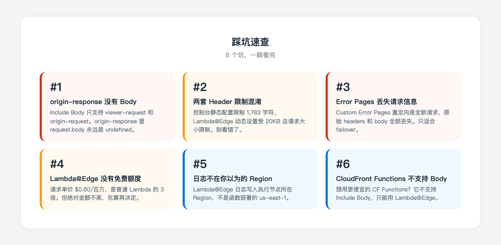 | Lambda@Edge (origin-request) | 请求体暂存 | 将 request body 写入自定义 header,传递给下游阶段 |