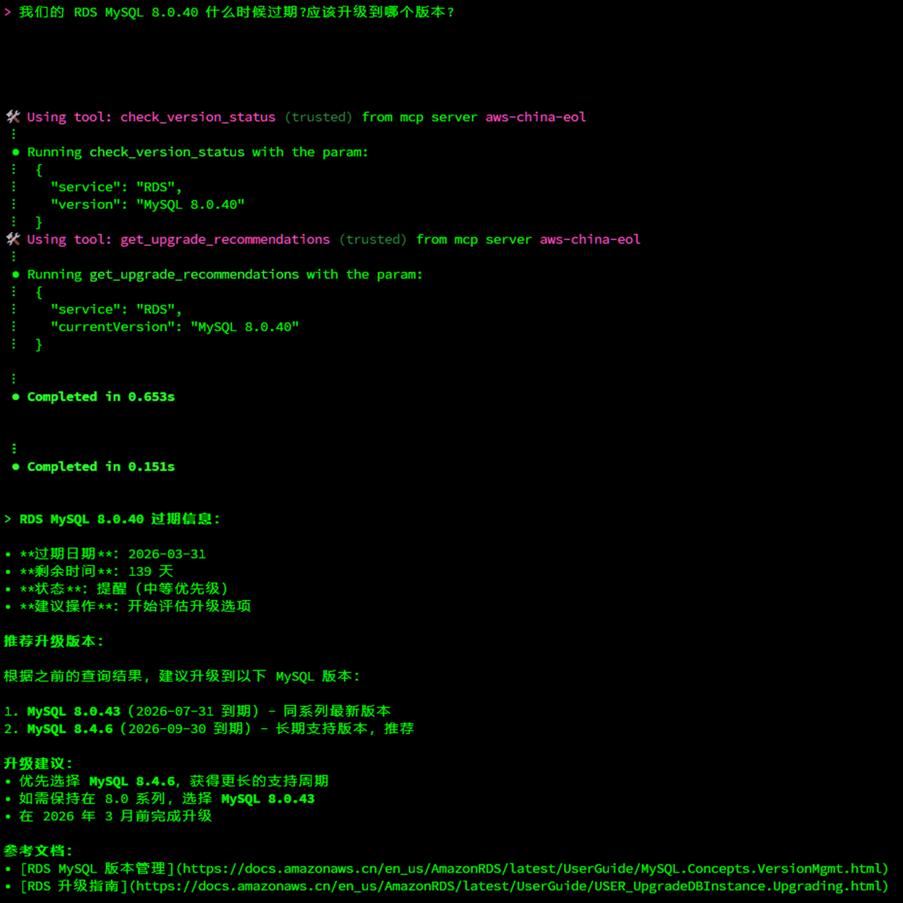 为了解决这些痛点,我们构建了一套基于 MCP(Model Context Protocol,模型上下文协议)的自动化 EOL 追踪方案,将版本生命周期管理能力直接集成到 Amazon Q Developer 等 AI 助手中,通过自然语言对话实现主动的基础设施管理。