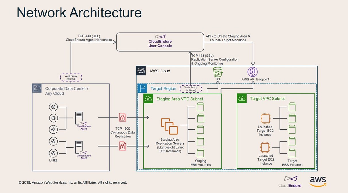 - 暂存区域子网和 CloudEndure 之间通过 TCP 端口 443 进行通信。