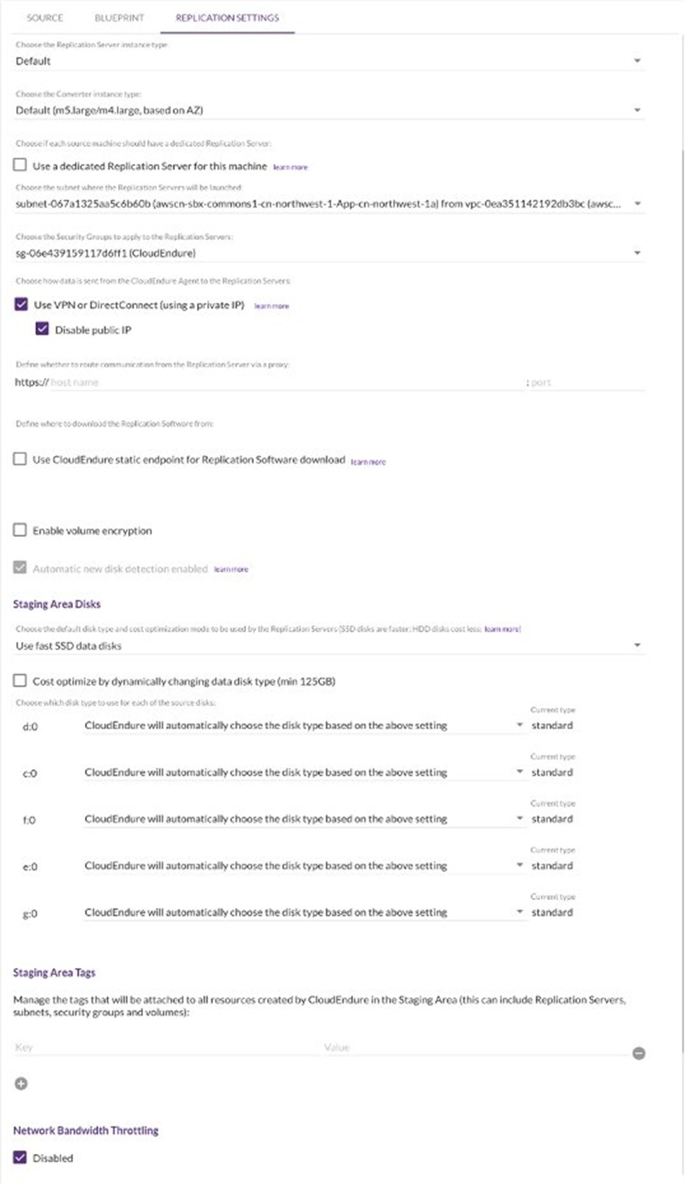 建议提供专线链路的专用带宽以提供稳定的连接。CloudEndure支持调整或限制复制带宽, 调整带宽大小时应考虑的因素包括必须传输的数据总量、源服务器的磁盘写入速度、源磁盘 I/O,为了确保达到CDP状态,CloudEndure默认情况下会尽量激进的占用最大带宽。如果源的硬盘性能高于云上存储性能,则会产生滞后CDP状态的情况。由于硬盘的所有写入量都将转化成数据复制的网络流量,考虑到专线价格较高,因此建议过滤掉没有必要进行灾备的写流量比如归档、备份与某些追踪日志等以优化复制网络带宽占用。