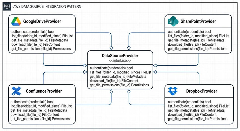 企业的知识资产分散在多个 SaaS 平台,每个平台都有自己的 API 和认证机制。为了实现统一的知识库,系统需要能够灵活地接入新的数据源,而不影响现有功能。