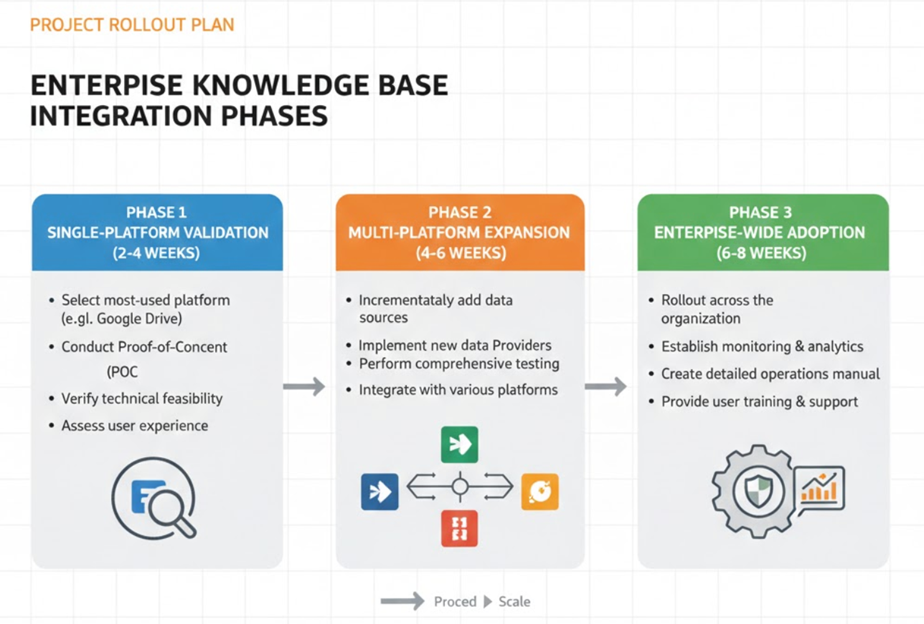 第一阶段:单平台验证(2-4 周) 首先选择企业使用最广泛的平台进行 POC 验证。这个阶段重点验证技术可行性和用户体验。
