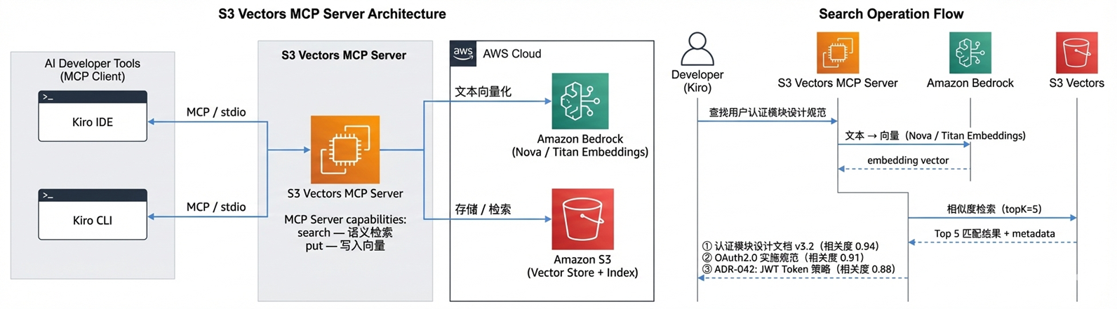 通过将 S3 Vectors MCP Server 接入 Kiro,AI 助手可以在生成代码时实时检索这些内部知识,给出符合企业规范的建议。