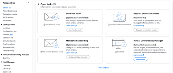 SES 提供了完整的 Setup Wizard(设置向导),特别适合第一次搭建邮件营销平台的用户。向导会引导你完成所有必要配置,确保不遗漏任何关键步骤。