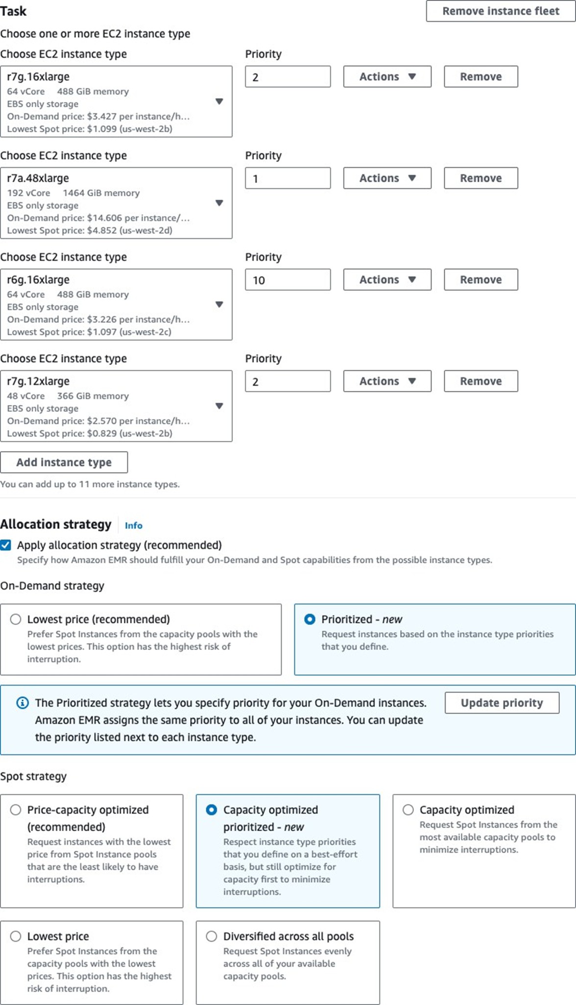 如果是在 EMR 控制台上,创建集群时需要选择 Instance Fleet,并且勾选 “Apply allocation strategy”,在 Allocation strategy中,On-Demand 选择 Prioritized,Spot 选择 Capacity optimized prioritized。