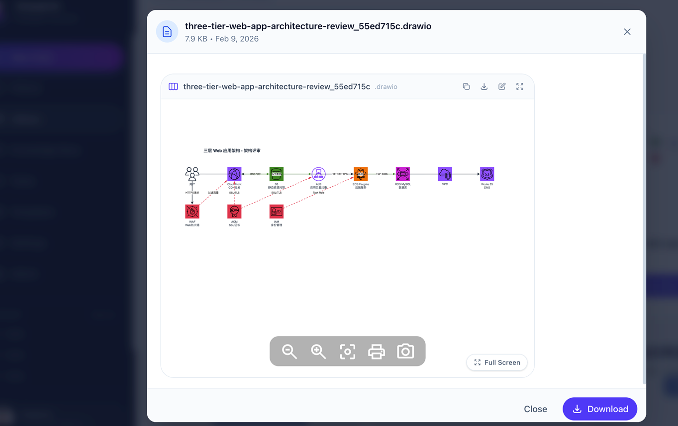 Agent 可以使用 AWS 官方图标生成 Draw.io 格式的架构图,支持在线查看和编辑。