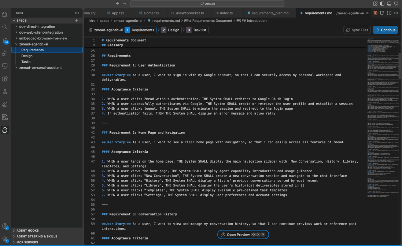 Kiro 自动生成了结构化的需求文档,包含用户故事、验收标准和技术约束: