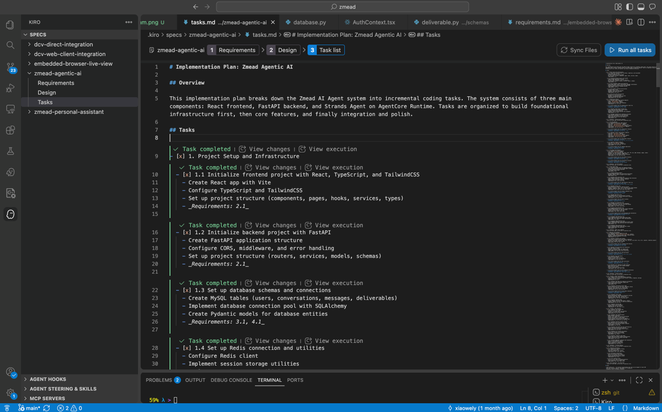 我们告诉 Kiro:“构建一个 delivery-focused 的 AI Agent 平台,用户通过对话让 Agent 产出图片、视频、文档、网页等交付物。后端用 FastAPI + Strands Agents,其中Strands Agents部署在 AgentCore Runtime 上。”