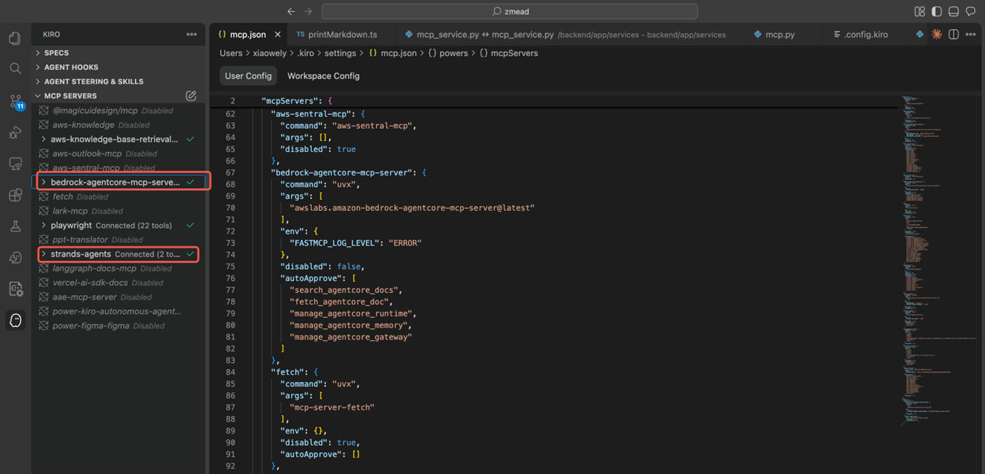 开发过程中,Strands Agents 和 AgentCore 都是较新的服务,文档在快速迭代。我们通过配置 Model Context Protocol (MCP) Server 让 Kiro 能实时参考最新的官方文档: