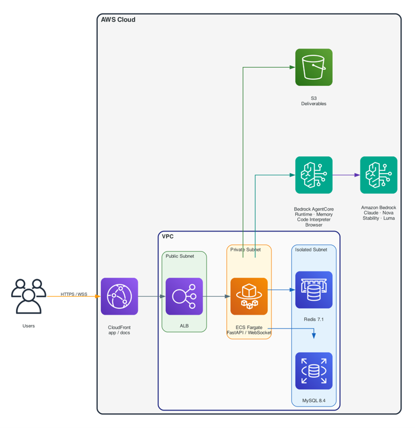 [图:平台整体架构——用户请求通过 CloudFront 进入 VPC,经 ALB 到达 ECS Fargate 上的 FastAPI 后端,Agent 通过 Bedrock AgentCore 调用大模型和工具,交付物存储在 S3 中。] |