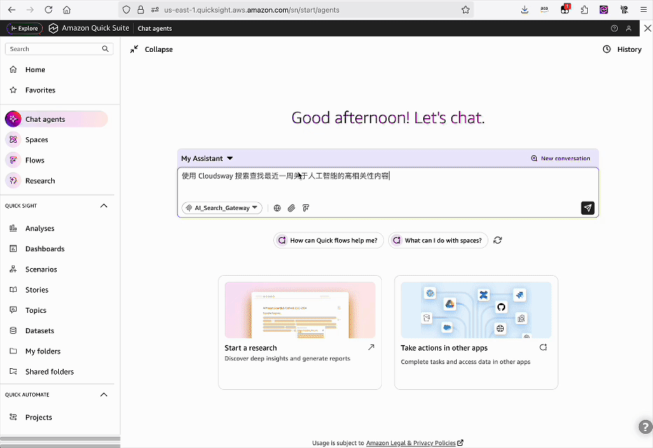 例如:用户在Quick Suite的Chat Agent中可以直接使用Cloudsway智能搜索获取实时新闻、技术文档等信息,提升信息获取效率。