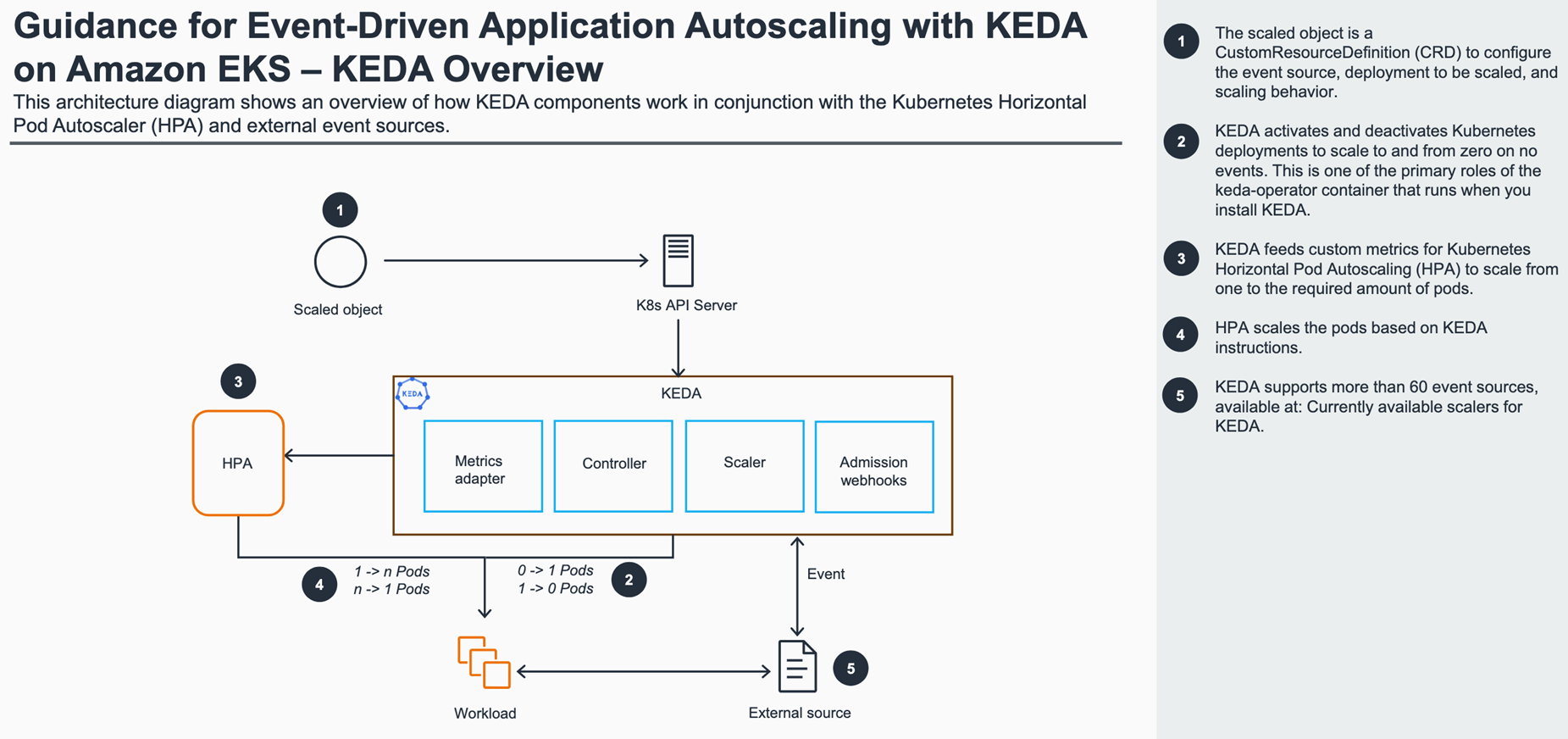 这种方式既保留了 Kubernetes 原生弹性,又增强了扩缩容策略的适应性。通过将 KEDA 与 Amazon EKS 结合,可以让 Pod 的扩缩容由“资源指标驱动”转变为“业务事件驱动”。这样,当业务队列长度、请求数、消息积压等指标发生变化时,应用能够更快速、精确地响应。
