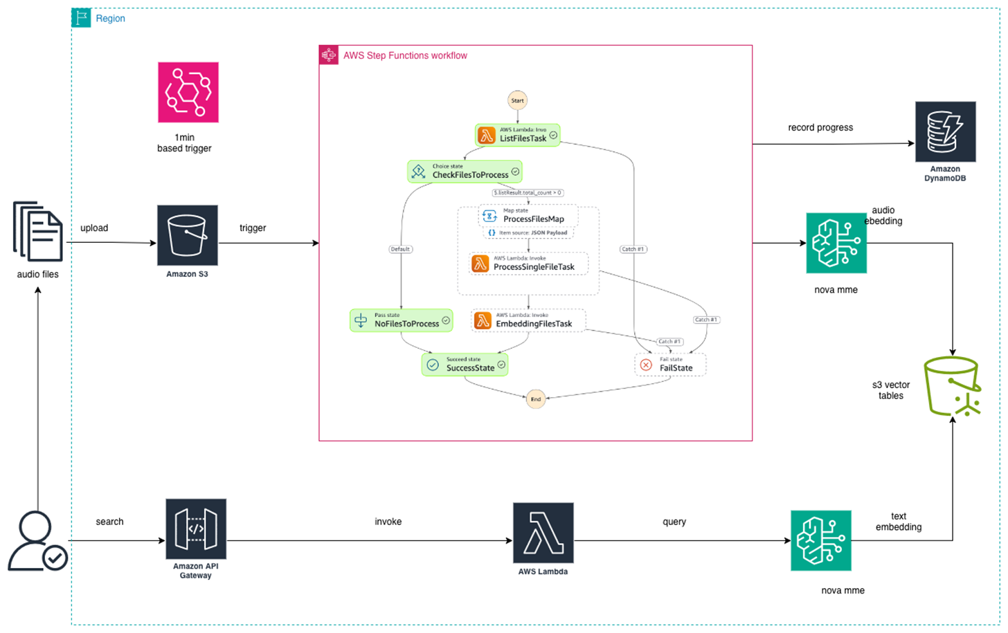 - stepfunctions的embeddingFiles: 将预处理好的音频文件通过NOVA MME进行embedding并存储到S3 Vectors