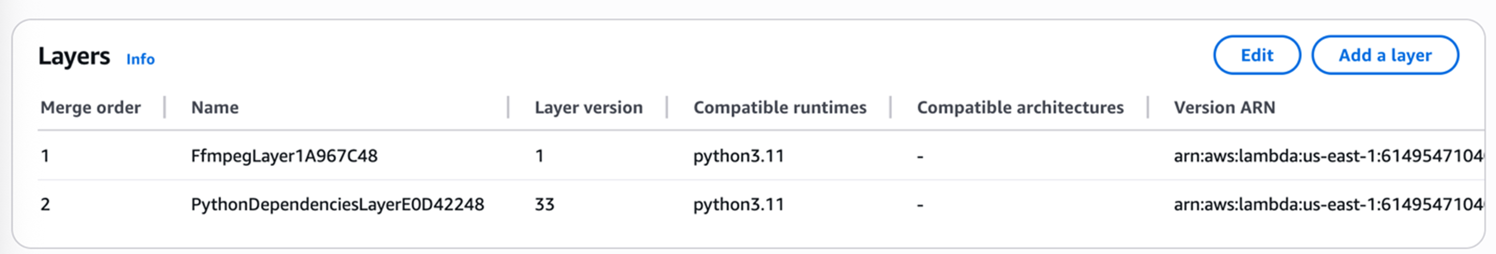 我们在构建step functions中的时候,需要依赖ffmpeg。项目中已经将相关的bin文件放置进去,部署时候自动会添加layer的依赖