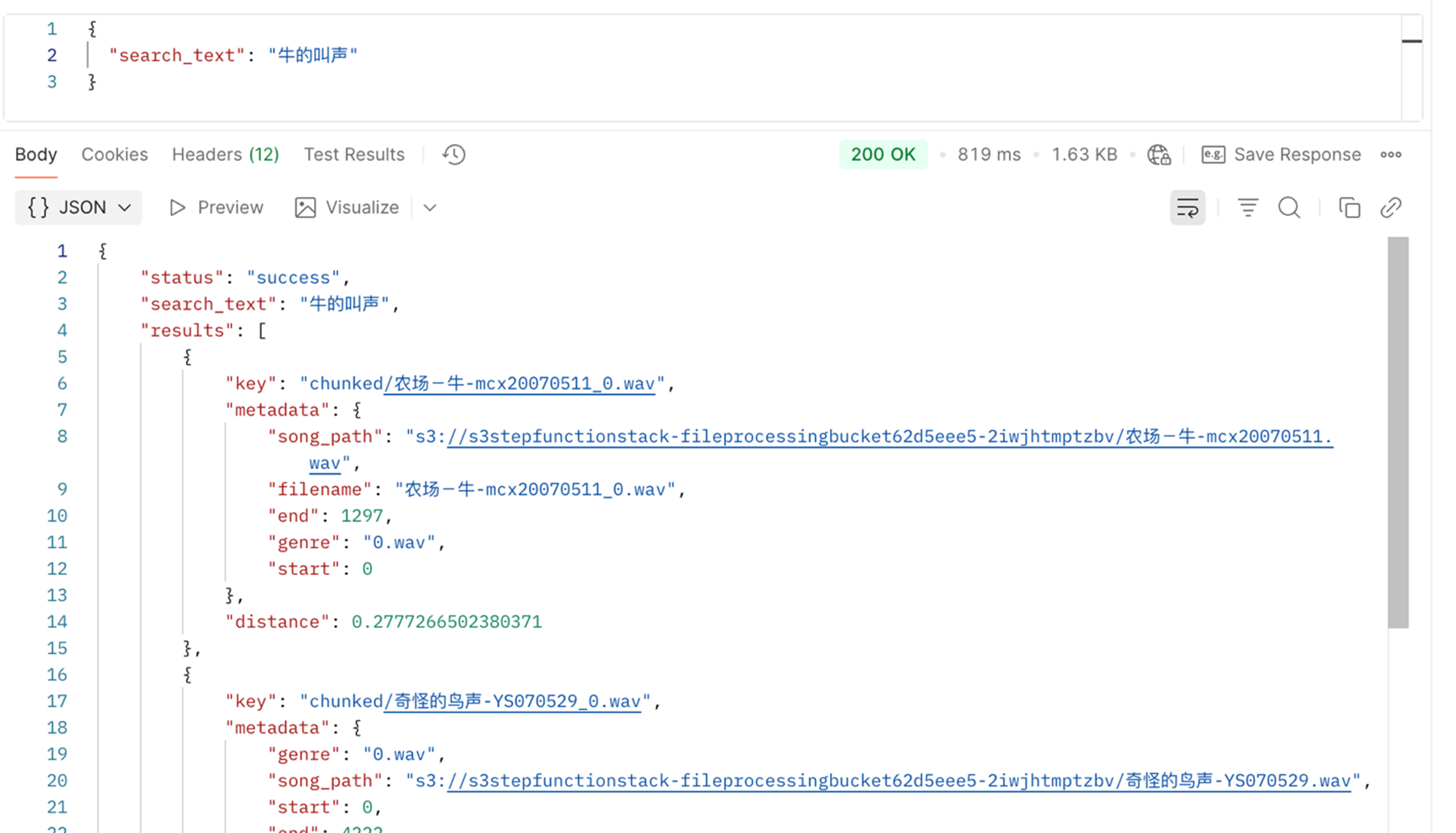 当我获取到APIGateway的对外endpoint之后,就可以开始测试了,这里假设,我们需要搜索一个“牛的叫声”,可以看到返回的结果中,”chunked/农场-牛-mcx20070511_0.wav” 出现在了第一个位置,并且也告知了其桶的位置,方便我们进行后续操作。